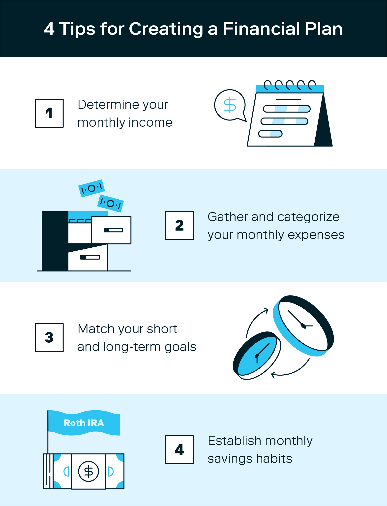 No matter your financial situation or goals, creating a detailed financial plan for young adults is a surefire way to keep yourself committed to financial success. A budget and a financial plan may sound very similar. A budget is a tool for tracking and managing your spending and savings on a day-to-day basis, while a financial plan actually maps out your goals over the long term and establishes your plan to achieve them.
