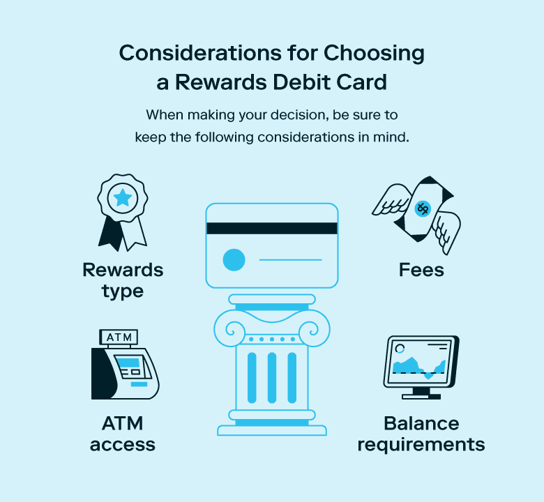 With the top debit cards with rewards in mind, it’s time to pick the one that fits your spending and rewards needs. While looking for the best debit card to get, keep the following factors in mind: