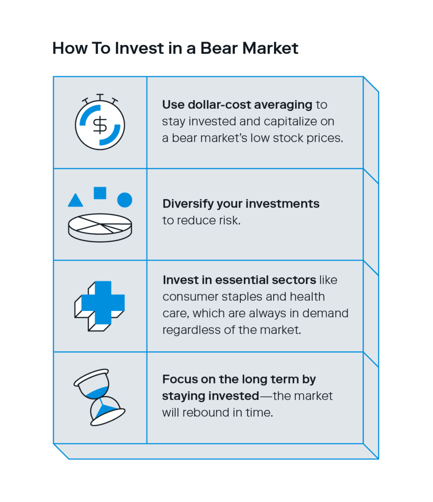 Look at sectors that perform well during bear markets: Consumer staples, health care, and other essential sectors usually withstand bear markets since they’re always in demand. Known as defensive stocks, they make great investment opportunities during periods of downturn.