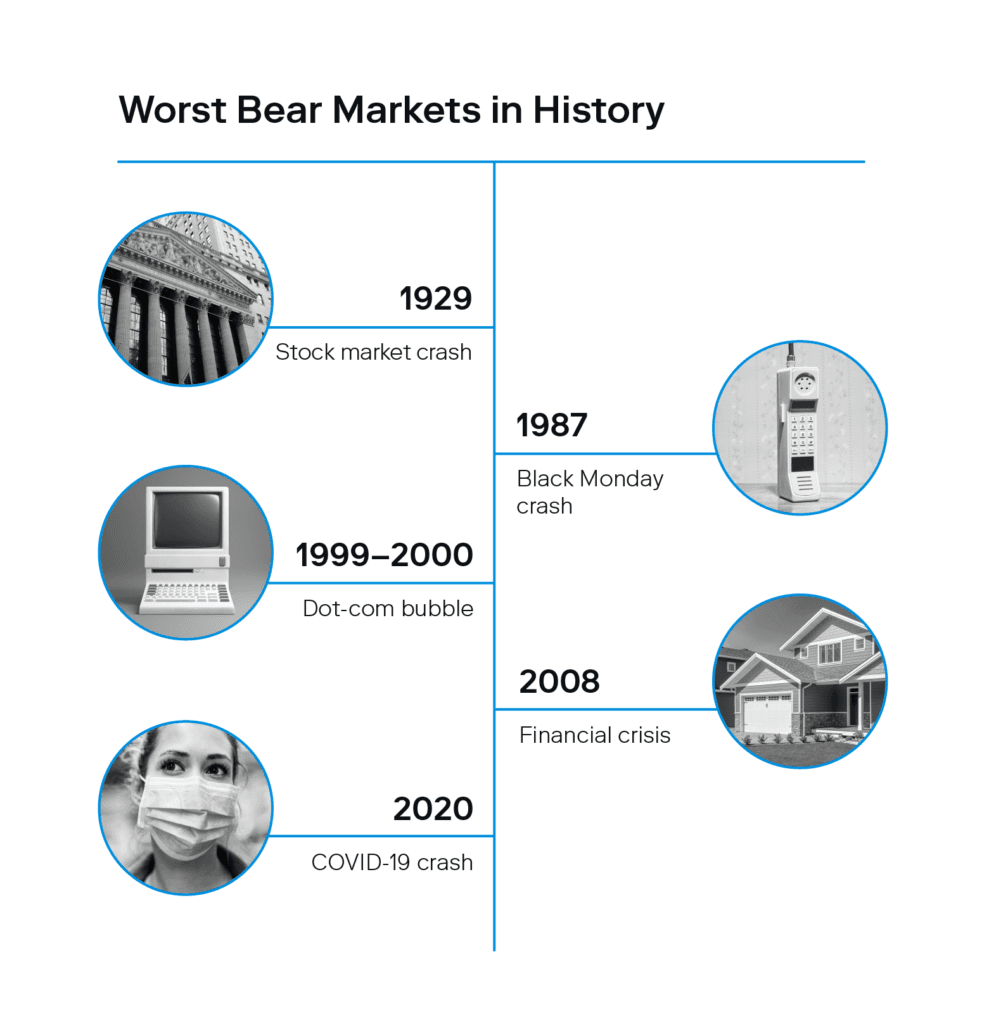 That said, there’s no way to predict the timing of a bear market with 100% accuracy, and history shows that the average bear market length can vary significantly. For example, the bear market in 1973–74 lasted a whopping 630 days, while 2020’s bear market in Q1 lasted just 33 days.