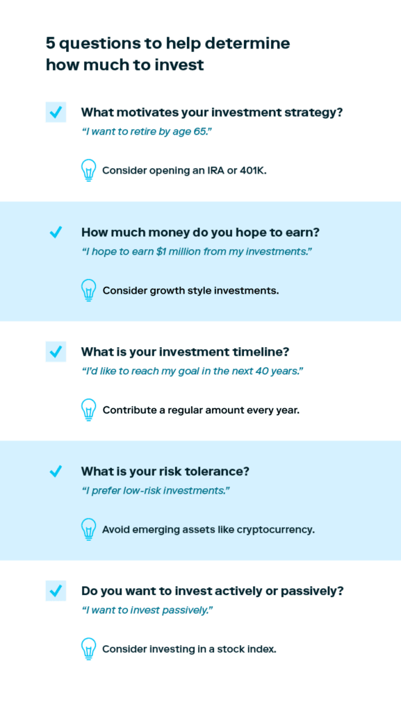The first step is identifying your goals. Knowing why you’re investing will help you figure out how much you should invest.