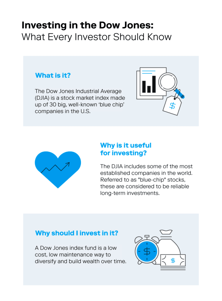 Investing in the Dow Jones Industrial Average is a popular way to diversify your portfolio and build wealth. In the case of a Dow Jones index fund or ETF, you gain exposure to some of the world’s most well-known and established companies without spending hours researching individual stocks.