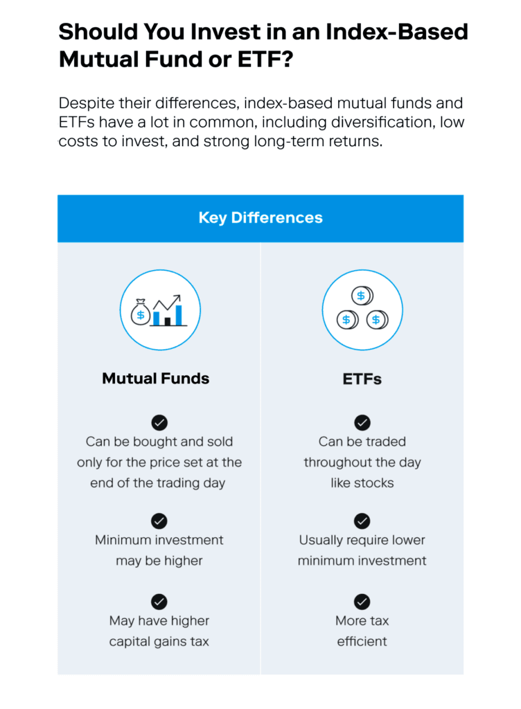 Minimum investment: in many cases, ETFs will have a lower minimum investment than index funds—sometimes, you might only need to pay the amount of a single share to get started.