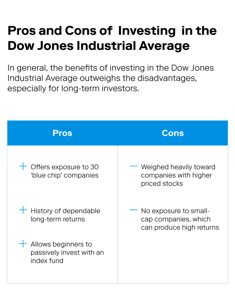 In general, the benefits of investing in the Dow Jones Industrial Average outweigh the disadvantages.