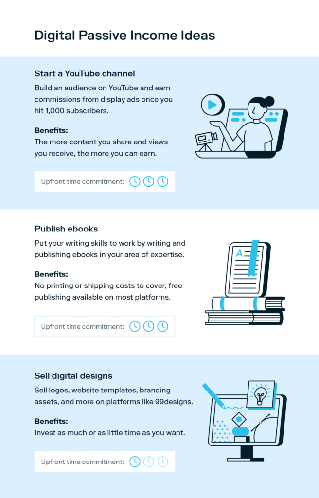 If you enjoy writing and have expertise in a particular subject, writing and self-publishing ebooks can be a lucrative passive income stream. They don’t require a lot of money to get started, either—as a digital product that you buy and sell online, there are no printing or shipping costs to cover. And, most platforms allow you to self-publish your book for free.