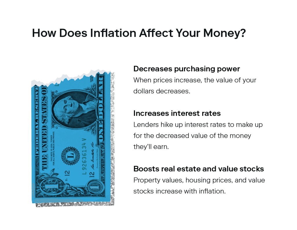 You’re likely already familiar with the most immediately noticeable effect of inflation. That is, price increases for goods and services. When prices increase, purchasing power decreases, meaning the value of your dollars is less than it was pre-inflation.