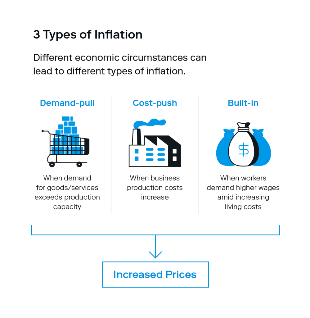 Inflation can be caused by a variety of factors, such as higher demand for goods and services or production shortages.These are the three main types of inflation:
