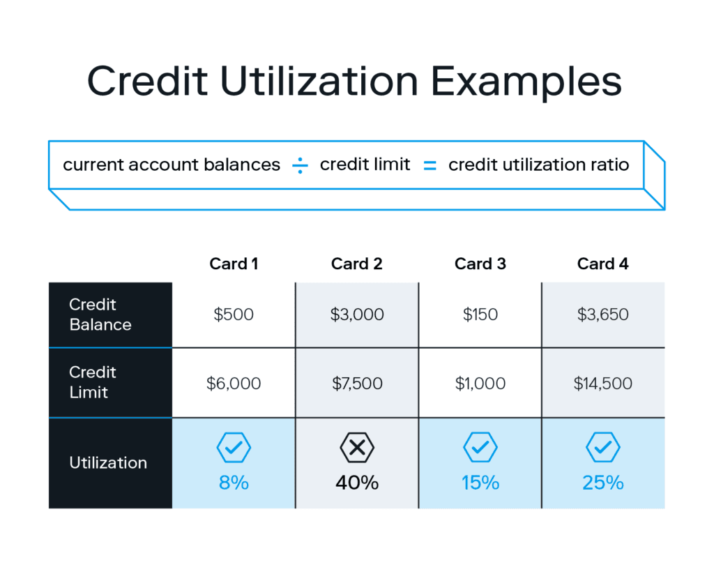 Credit utilization is a ratio of your credit balance (how much credit you’re using at any given time) and your total available credit. For example, if your credit balance is $500 and your total credit limit is $2,000, your credit utilization at that time is 25%.