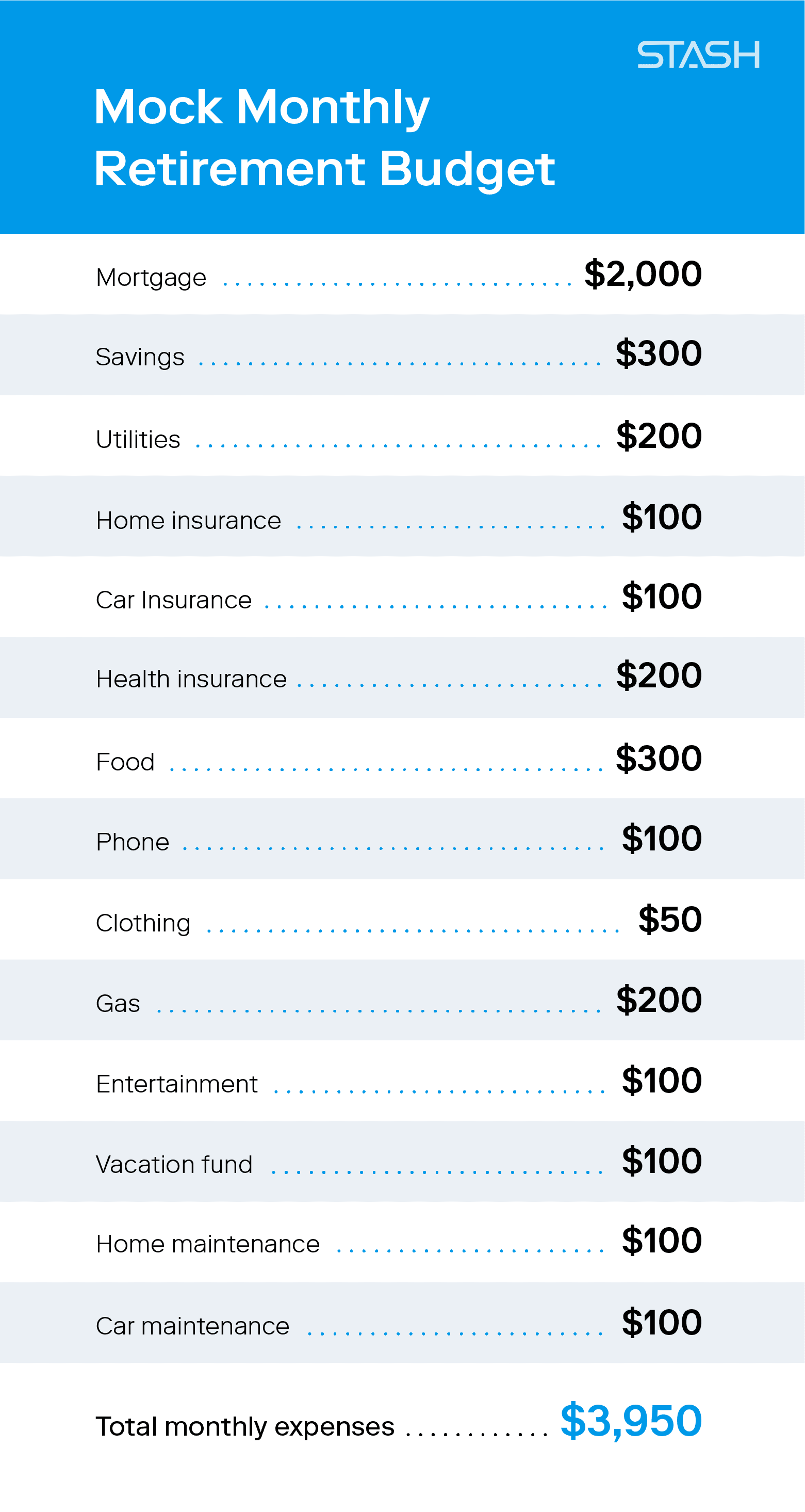 Then, list your expected monthly spending. Many of your expenses will stay more or less the same in retirement, so take a look at your current costs (food, utilities, medical, insurance, internet, car, etc.) and use those numbers as a baseline.Adjust each item as needed based on your personal retirement goals. For example, if you know you want to buy a new car for retirement, estimate the monthly payments required for the new car versus the one you currently have.