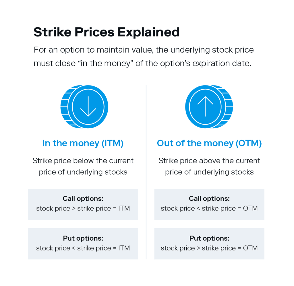 A strike price can fall into one of two categories: “in the money” and “out of the money.” These refer to the underlying stock’s price in relation to the strike price of the options contract.