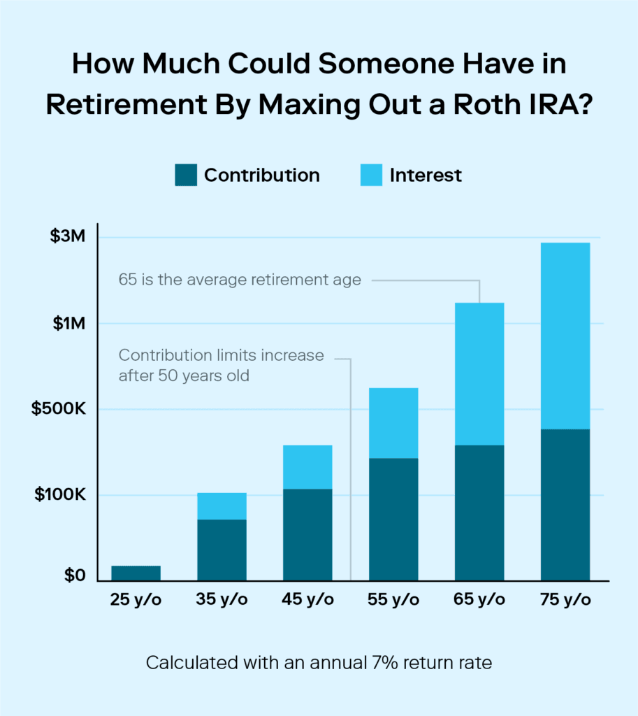 The chart below shows hypothetically how much someone could have in their Roth IRA if they started maxing out their contributions at age 25. We calculated the results with an annual 7% return rate. Though the chart starts at age 25, it’s never too early (or too late) to open a Roth IRA.