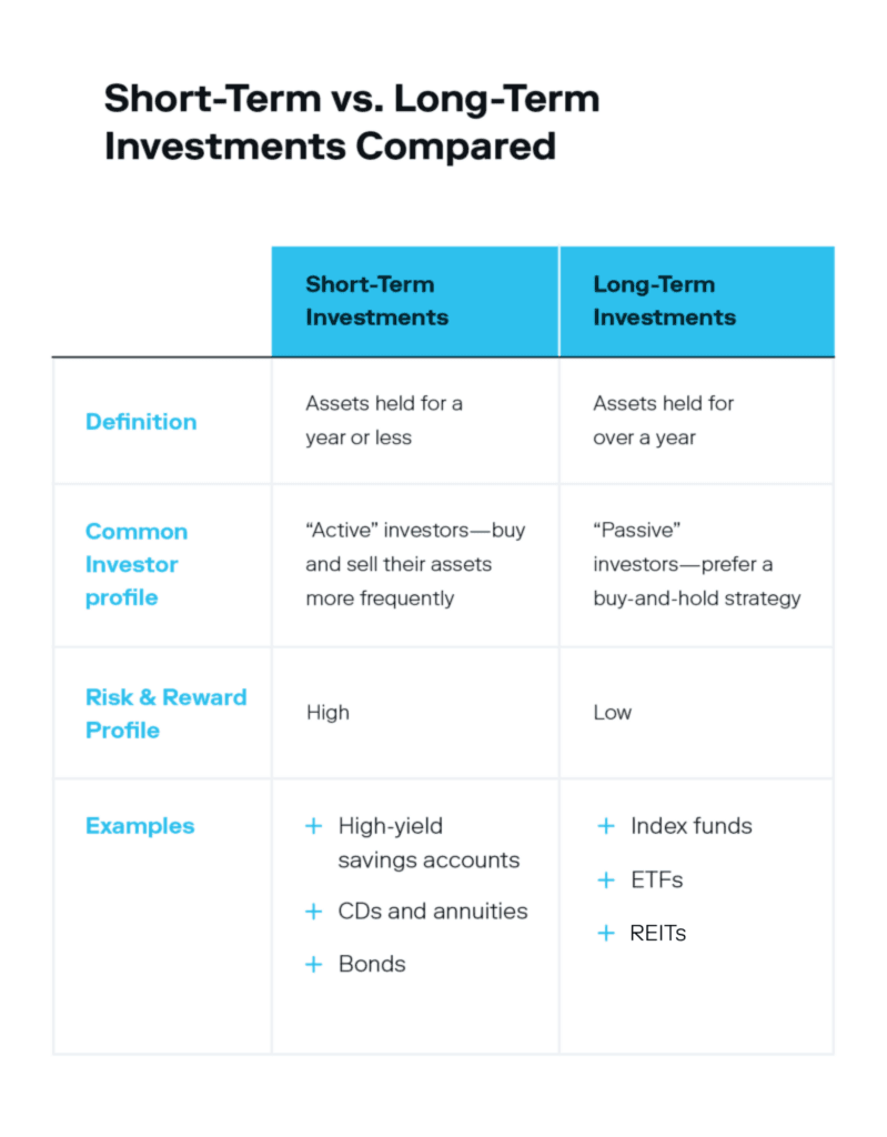 While the biggest difference between short-term and long-term investments is time, there are a few others to know, such as active versus passive investing.