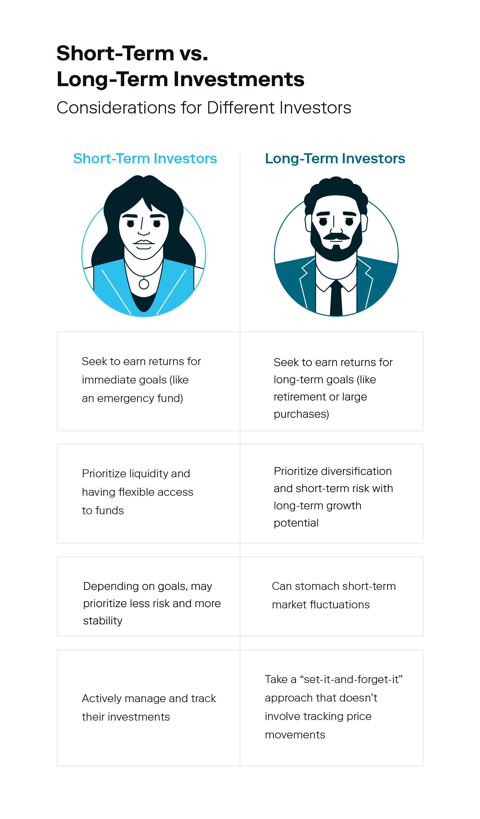 Short-term vs. long-term investing refers to how you use different investments based on your financial goals and time horizon. The main difference between the two lies in how you approach an investment, not in the investment itself. Both short-term and long-term investments can include any asset class. A stock, for example, can be a short-term or long-term investment depending on how you use it, like buying and selling a stock within a single month versus buying and holding a stock for several years.