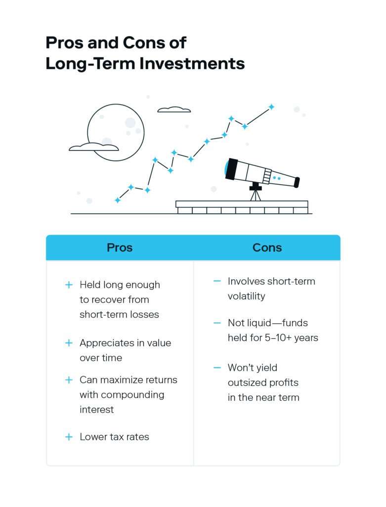 Long-term investments are assets held for at least a year or more, and are often used to fund long-term financial goals like saving for retirement. Long-term investors tend to invest with the expectation that their investment will appreciate in value over time, despite short-term volatility. Common long-term investments include: