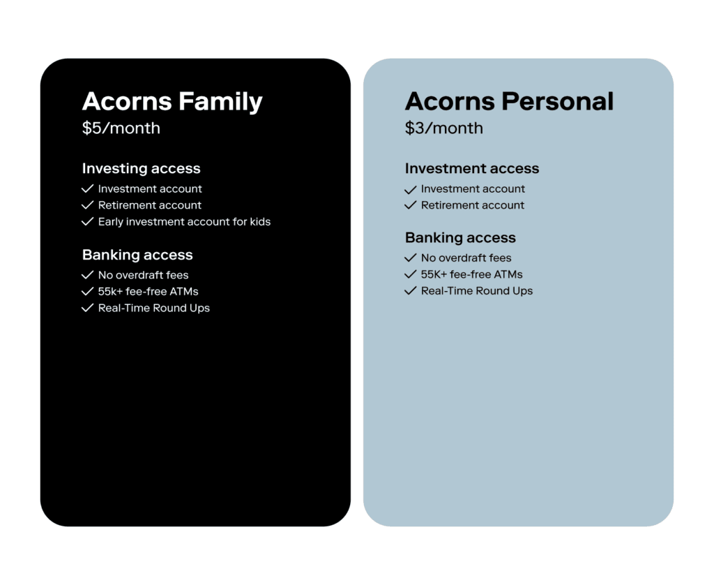 The only difference between the Personal plan and Family plan is the Family plan includes Acorns Early, which gives access to custodial accounts for kids. If you don’t yet have children and just want a personal investment account, retirement account, and banking perks, Acorns Personal is likely the best fit for you.
