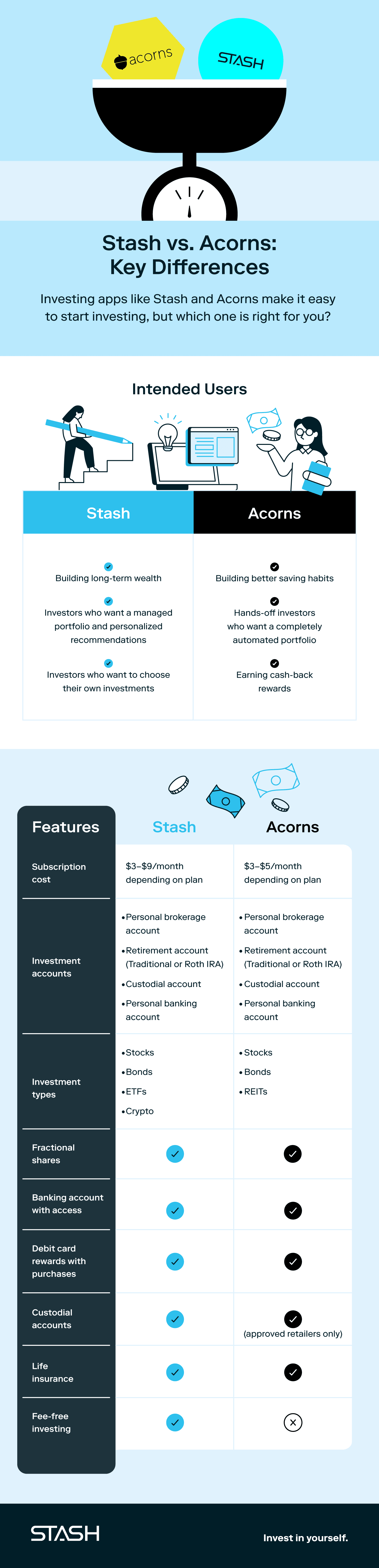 Both Stash and Acorns let you invest in stocks, exchange-traded funds (ETFs), and fractional shares, and you can start investing on either platform with just $5. They have a similar monthly fee structure, and each basic plan starts at $3 per month.