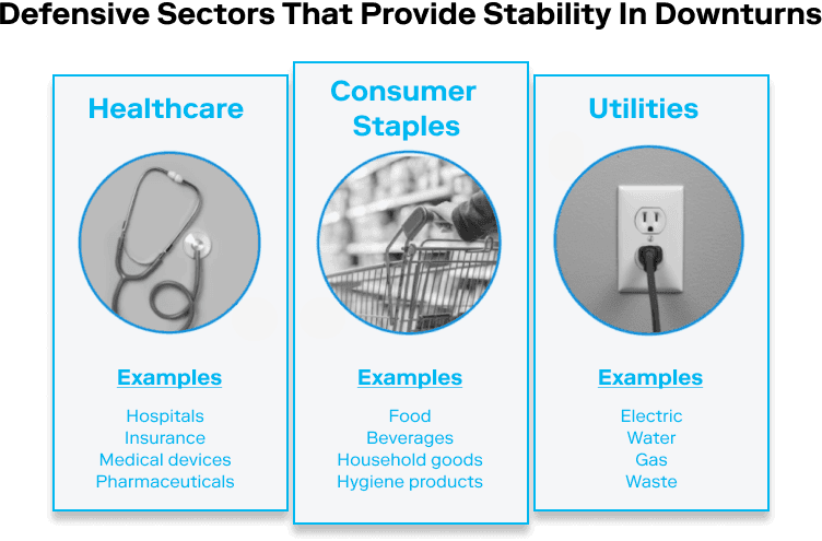 Utilities, consumer staples, and healthcare represent the main defensive sectors. These sectors are considered essential and typically maintain their income streams and overall stability even when the market is volatile.