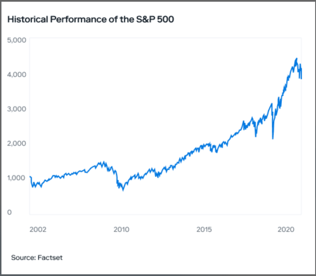 We’ve shared this graph with you before, but it’s essential to keep top of mind. The following shows the performance of the S&P 500 for the last 25 years. The S&P 500 is an index that reflects the earnings of the 500 biggest companies in the U.S., and it’s considered a benchmark for the entire stock market. Over time, you’ll see that the price of stocks tends to go up. You’ll notice this chart includes some pretty steep sell-offs in the past, such as the Dotcom bust, the mortgage crisis that led to the recession in 2009 and, more recently, the sell-off that occurred in March 2020 when the Covid pandemic began.