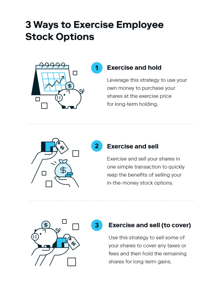 Exercise and hold: In this method, you’ll use your own money to purchase your shares at the exercise price and then hold them for a short or long term period. This method can be risky because there is no guarantee you’ll make any money, as the stock price could plummet after your purchase.